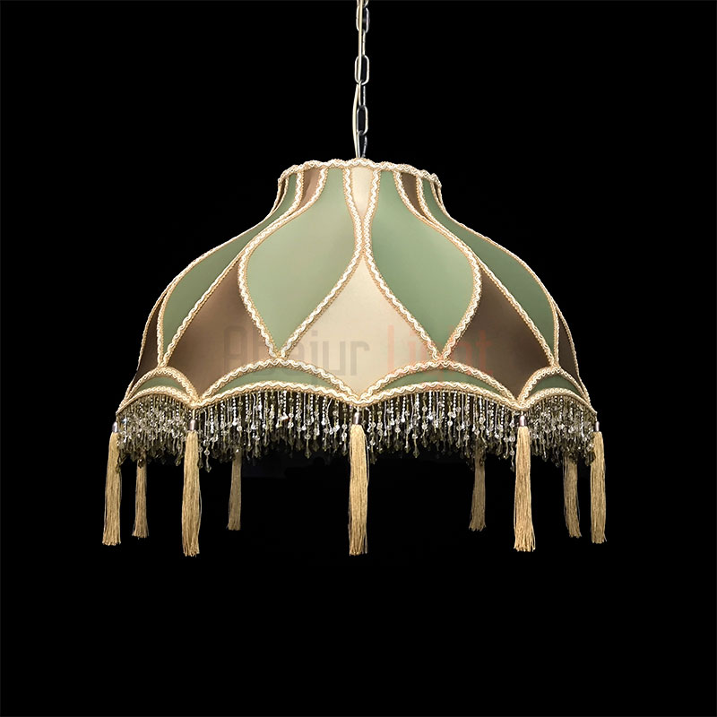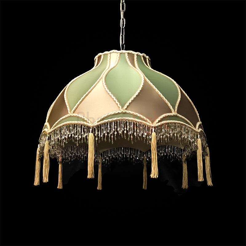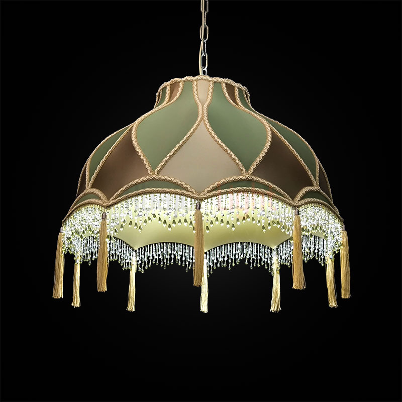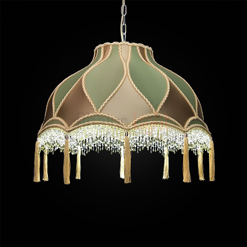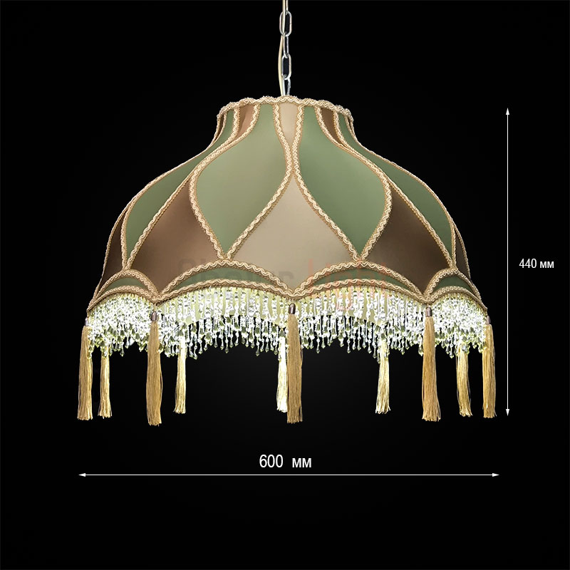 Элегантный подвесной абажур Алиса с отделкой из ткани под шёлк в изысканном сочетании бронзового и зелёного оттенков. Модель декорирована сутажной тесьмой, дополнена бахромой из стекляруса и кистями — эти детали придают изделию роскошный акцент. Диаметр абажура — 60 см, подвешивается на декоративной цепи, которая гармонично вписывается в общий дизайн. Идеальный выбор для создания утончённого интерьера.