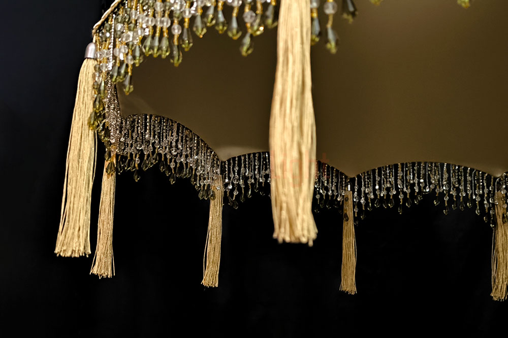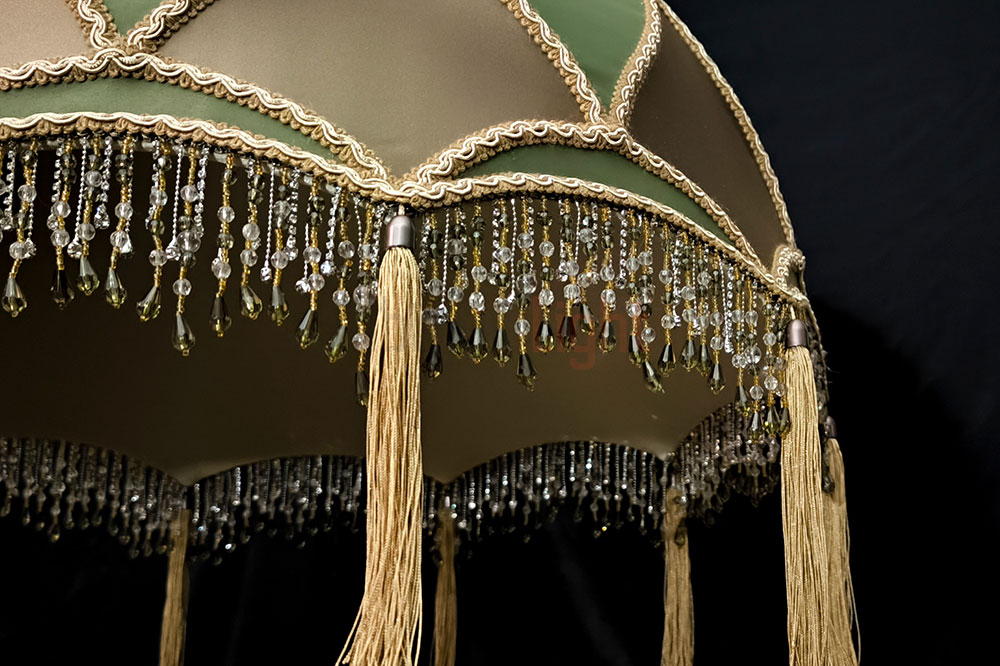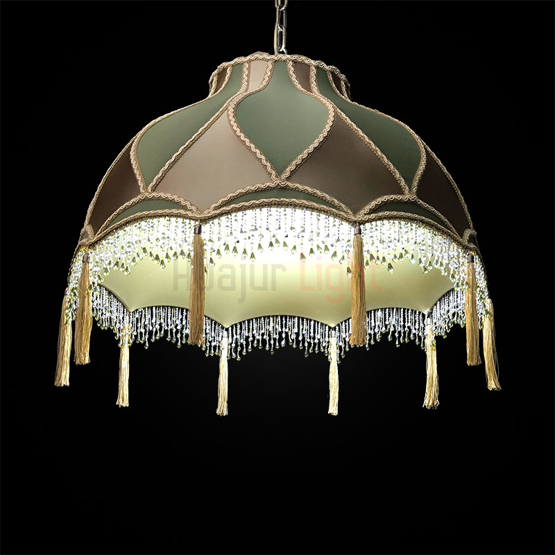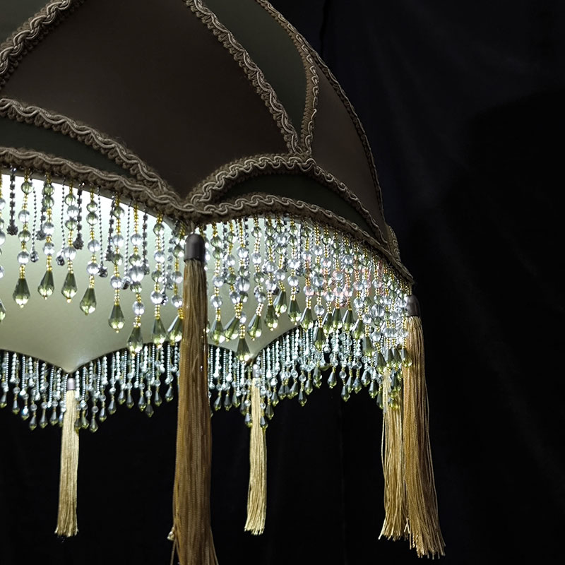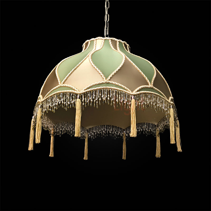 Элегантный подвесной абажур Алиса с отделкой из ткани под шёлк в изысканном сочетании бронзового и зелёного оттенков. Модель декорирована сутажной тесьмой, дополнена бахромой из стекляруса и кистями — эти детали придают изделию роскошный акцент. Диаметр абажура — 60 см, подвешивается на декоративной цепи, которая гармонично вписывается в общий дизайн. Идеальный выбор для создания утончённого интерьера.