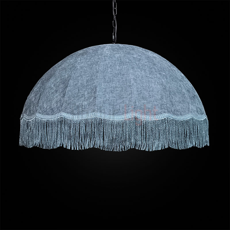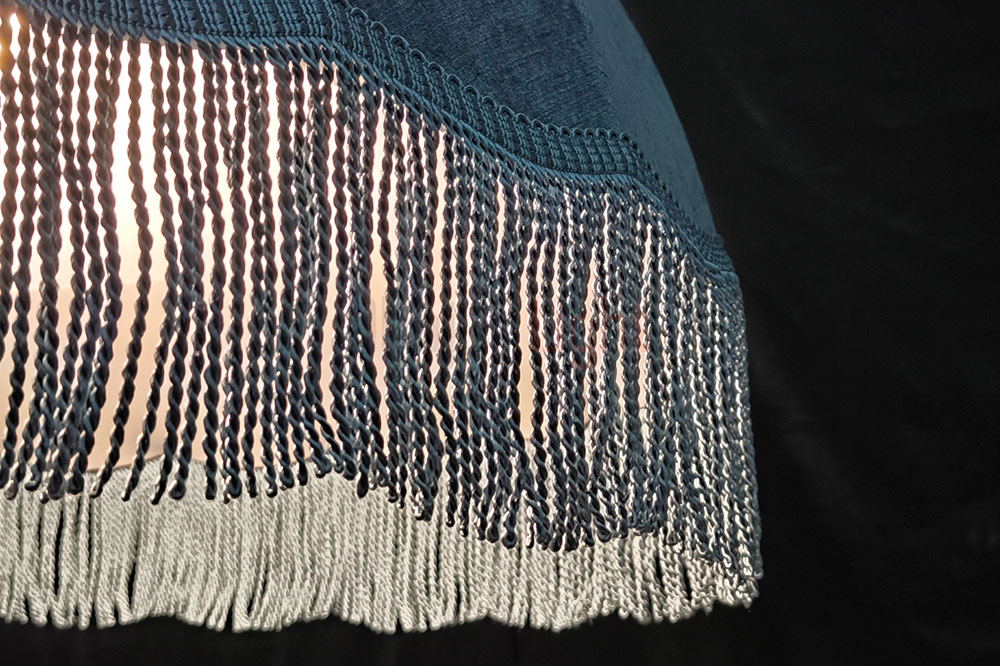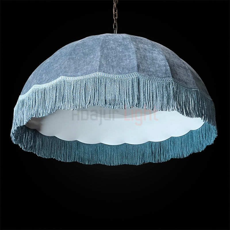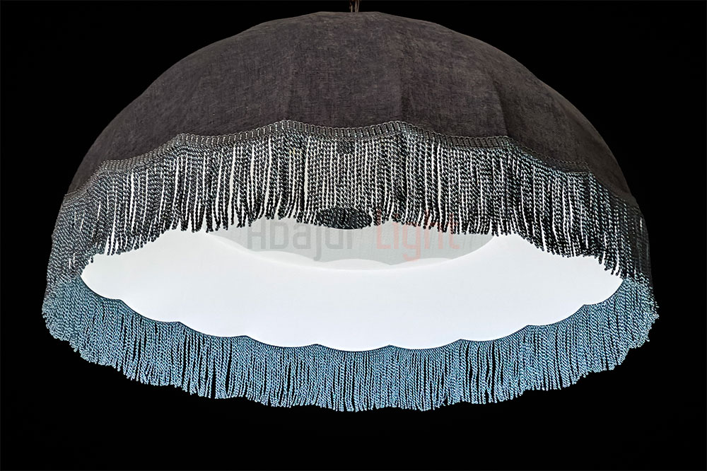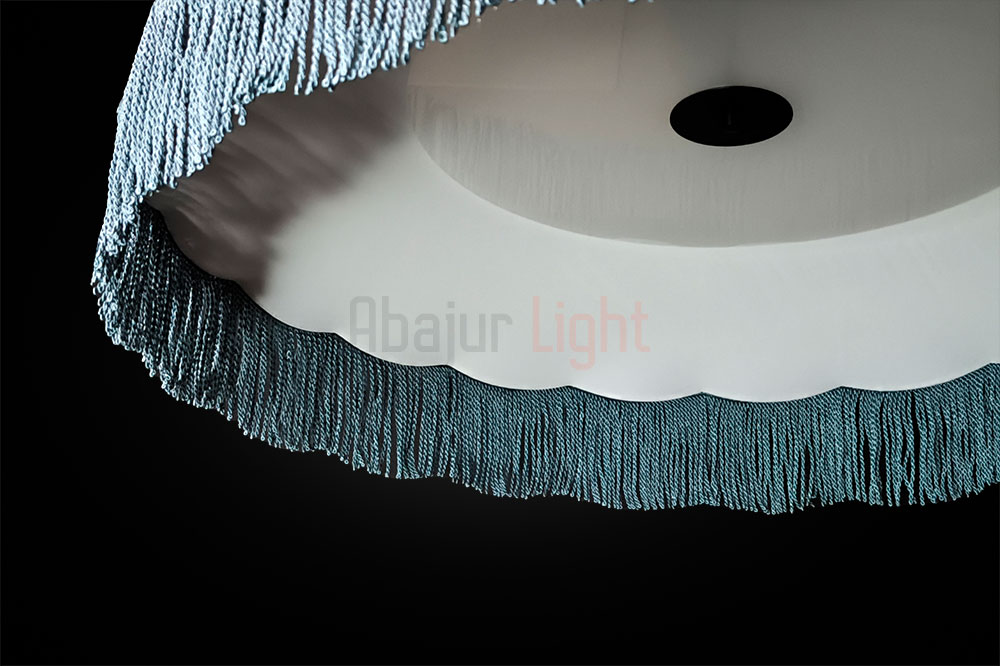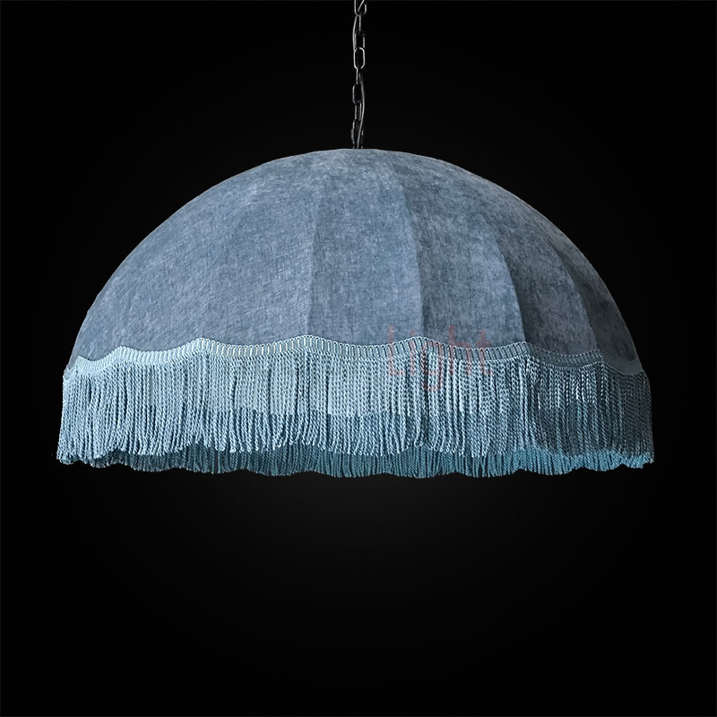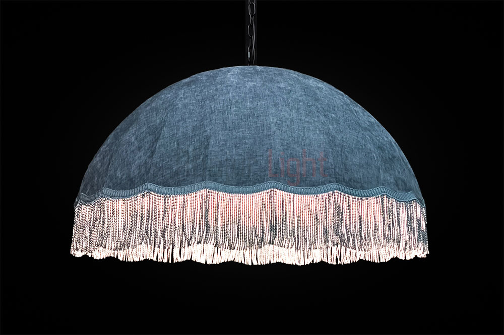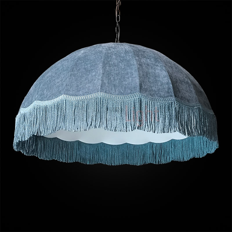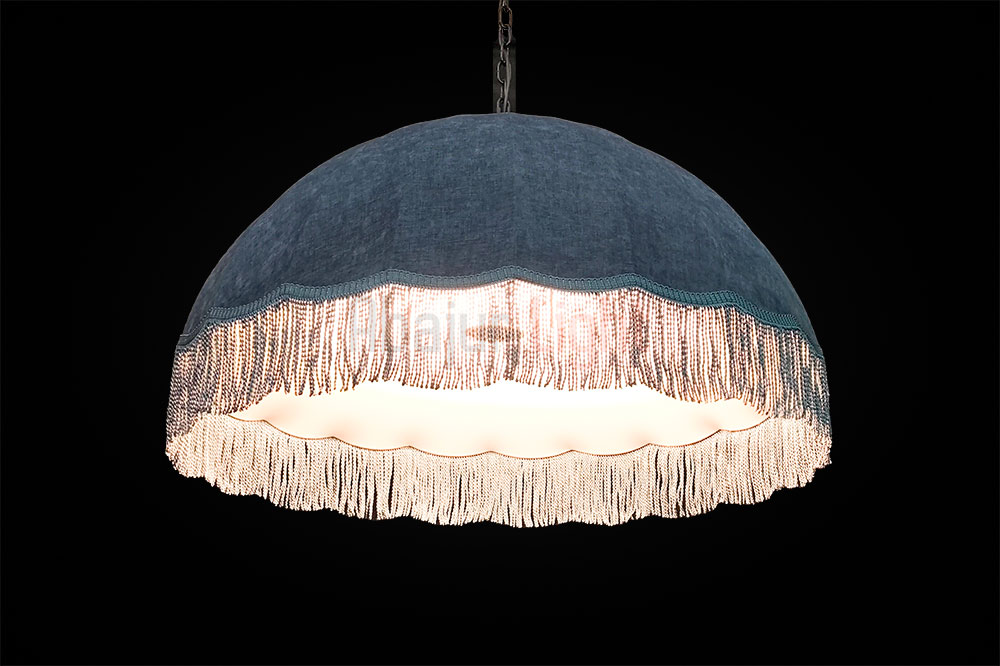 Подвесной абажур Тея в форме купола обтянут фактурной синей тканью и украшен синей бахромой; рассчитан на 5 ламп типа Е27, которые прикрыты молочным рассеивателем; диаметр модели составляет 1 метр, подвешивается на декоративной чёрной цепи; доступны другие размеры и цвета — по индивидуальному заказу.